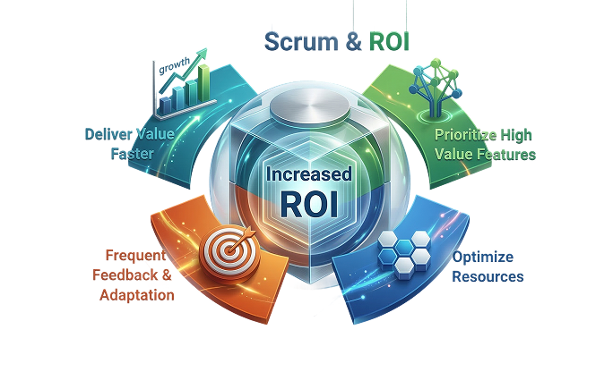 Scrum improves ROI by helping teams prioritize high-value work, deliver usable increments faster, respond to feedback early, and make better use of time and resources.